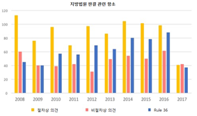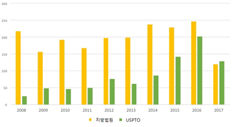 - (주요내용) 최근 지방법원의 판결에 대한 항소보다 미국 특허상표청(USPTO)의 심결에 대한 항소가 크게 증가하는 경향이 강하게 나타나고 있음 ∙ 미국 연방순회법원 역사상 처음으로 2017년 상반기 USPTO의 심결에 제기된 항소 건수가 지방법원의 판결에 제기된 항소 건수를 초과한 것으로 나타남
