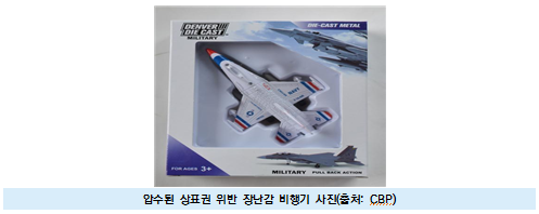 - (배경) 대외 무역이 늘어남에 따라 파렴치한 기업들이 위조품 및 불법 복제품 판매로 수십억 달러의 불법 수익을 올리고 있음 ∙ 이러한 위조품 및 불법 복제품 판매에 대하여 CBP는 지식재산권 보호 프로그램을 통해 기업과 소비자를 보호하고 있으며, 위조 및 불법 제품의 수입 금지를 목표로 삼고 특허 침해 및 기타 지식재산권 관련 제품에 대한 배제 명령을 시행하고 있음 - (주요내용) CBP의 현장요원은 Minnesota 주 International Falls 통관항(Port of Entry, POE)에서 Ranier 통관항으로 가는 철도 컨테이너를 대상으로 위조상품 단속을 실시함 ∙ CBP의 담당관은 상품 검사를 통해 라이선스와 상표를 조사했으며, 상표권자와의 면담을 통해 수입업자 또는 제조업체가 상표를 표시하거나 상품을 제조할 수 있는 라이선스가 없는 품목을 압수함 ∙ 결과적으로 CBP는 장남감 비행기 위조품 36,000대(약 575,000 달러 추정)의 압수 조치를 통해 위조품 판매를 예방함 - 이와 관련하여 CBP는 위조품의 유통을 중단하는 것은 CBP의 무역 관련 최우선 문제이며, 위조품을 수입하면 미국 경제가 손상되고 미국 국민의 건강과 안전이 위협받을 수 있다고 강조함 ∙ 또한, International Falls 통관항 Anthony Tony Jackson 소장은 CBP가 상품의 합법적 수입을 촉진하면서 위조품 단속강화에 초점을 맞추고 있다고 언급함