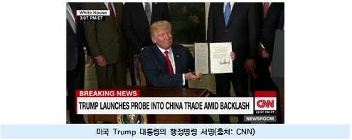 - (배경) 2017년 8월 4일, 미국 백악관은 지식재산권 침해 조사 명령을 계획했으나, UN 안전보장이사회의 대북제재 결의에 중국이 협조를 약속하면서 이를 유보한 바 있음 ∙ 2017년 8월 13일, 미국 Trump 대통령은 중국 시진핑 주석과 전화 통화에서 USTR의 지식재산권 침해 조사를 예고한 바 있음1) ∙ 2017년 8월 14일, 미국 Trump 대통령은 미국 통상법(U.S. Trade Act) 301조2)를 근거로 중국의 지식재산권 관행을 조사하는 것을 USTR에 지시한 행정명령에 서명함 - (주요내용) USTR은 미국 Trump 대통령의 행정명령에 따라 미국 기업에 대한 중국의 지식재산권 침해를 비롯한 부당한 무역 관행에 대해 공식적인 조사에 착수함 ∙ USTR Robert Lighthizer 장관은 성명을 통해 여러 이해 관계자와 정부 기관들과의 협의를 거쳐 지식재산권 침해 등 중대 사안들을 철저히 조사하기로 결론을 내렸다고 발표함 ∙ USTR은 10월 10일 관계 부처 간의 공개 청문회를 가질 예정이며, 9월 28일까지 이 문제에 관심있는 사람들에게 의견서를 제출하도록 요청함 • 이와 관련하여 2017년 8월 15일 중국 상무부는 미국 Trump 대통령의 행정명령에 대해 미국이 다자간 무역 협상을 무시하고 양국 간 교역을 저해할 경우 중국의 권리를 지키기 위해 모든 적절한 조치를 취할 것이라고 입장을 표명함3) ![]() 1) 관련 내용은 본 연구원 동향 「Issue & Focus on IP」 2017-33호 참조: https://www.kiip.re.kr/board/trend/view.do?bd_gb=trend&bd_cd=1&bd_item=0&po_item_gb=US&po_no=16960 2) 1974년 제정된 미국 통상법(U.S. Trade Act) 301조는 1995년 세계무역기구(WTO) 창설 이후 거의 사용되지 않았지만, 미국 산업을 보호하기 위해 미국 대통령이 단독으로 과세나 다른 무역 제재를 가할 수 있도록 허용하고 있음. 3) 관련 내용은 본 연구원 동향 「Issue & Focus on IP」 2017-34호(동호) 참조. |