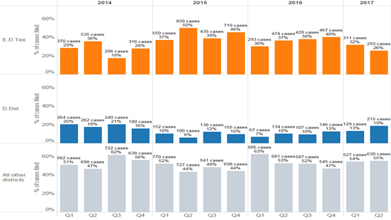- (특허 소송 건수) 2017년 2분기에 1,138건의 특허 소송이 제기되었으며, 2017년 1분기에 제기된 특허 소송 건수(967건)보다 18% 증가한 것으로 나타남 - (지방법원의 소송 건수) 최근 몇 년간 텍사스동부지방법원의 특허 소송 건수가 약 30~40%를 차지하여 가장 높은 비중을 기록하고 있으나, 대법원의 T.C.Heartland 판결1) 이후 텍사스동부지방법원에 제기된 소송 건수는 감소 추세이고 델라웨어지방법원에 제기된 소송 건수는 증가 추세로 나타남