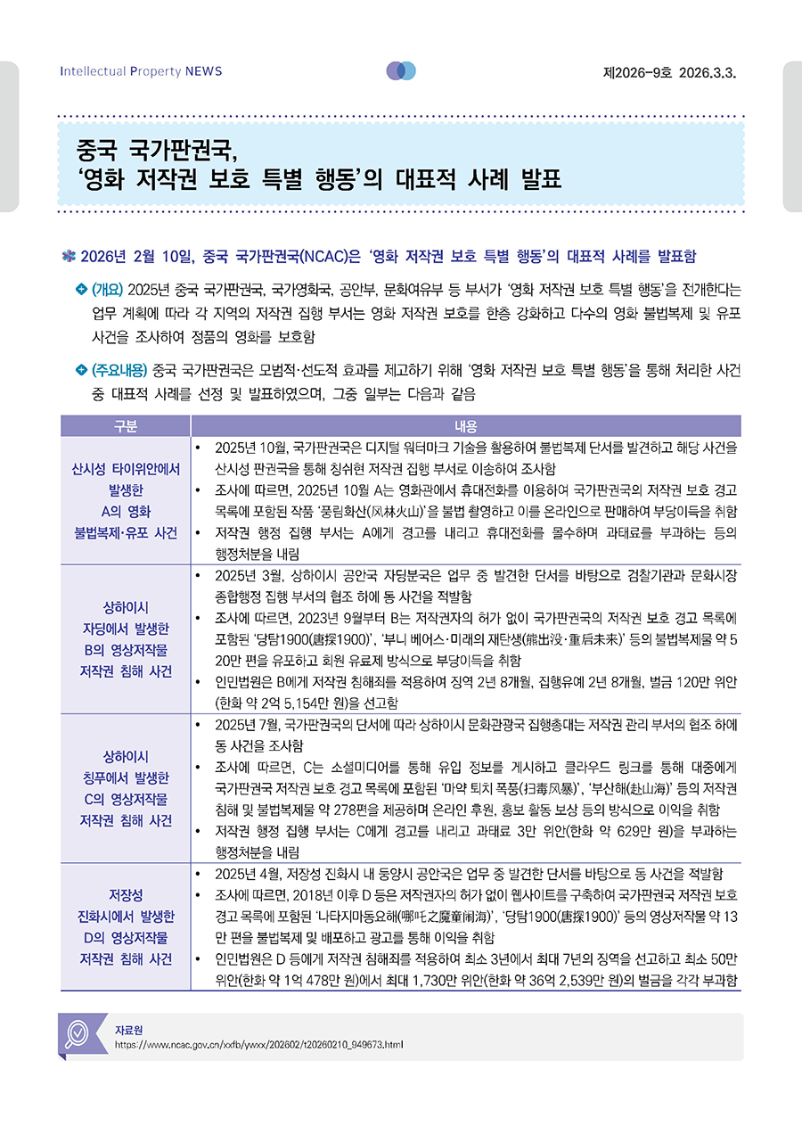 중국 국가판권국, '영화 저작권 보호 특별 행동'의 대표적 사례 발표