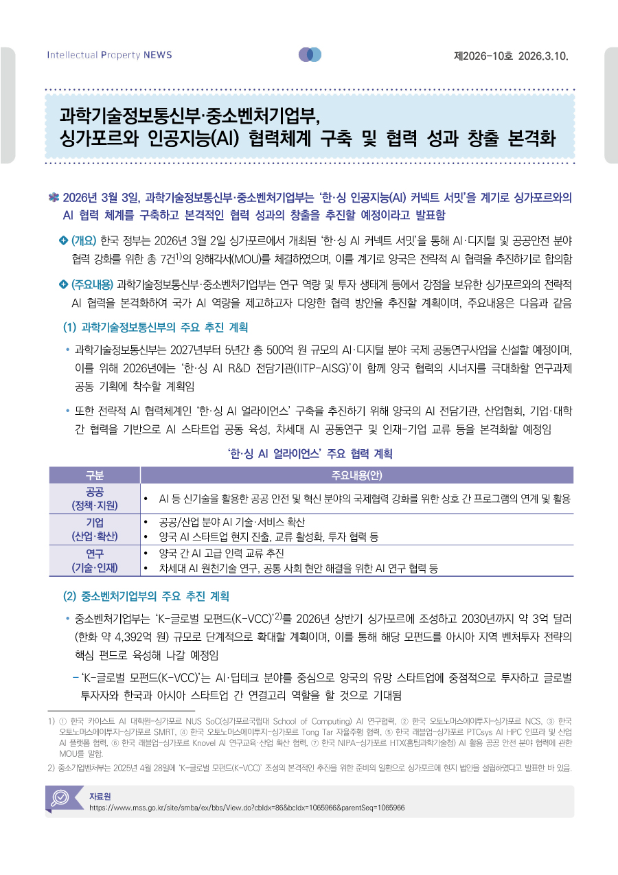 | 과학기술정보통신부·중소벤처기업부, 싱가포르와 인공지능(AI) 협력체계 구축 및 협력 성과 창출 본격화 |