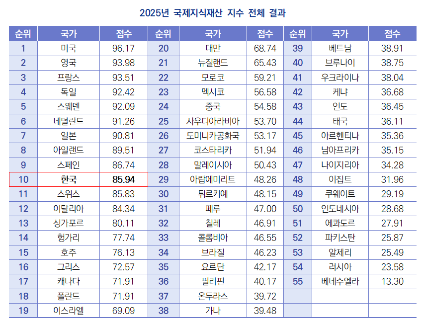 | 미국 상공회의소, ‘2025년 국제지식재산 지수’ 발표 |