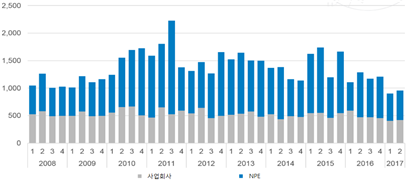 - (주요내용) 2017년 특허 분쟁이 전년도에 비해 감소한 것으로 나타났으며, 주요내용은 다음과 같음 ∙ 2017년 2분기에 NPE는 특허 소송으로 약 530명을 제소하였고, 사업회사(Operating Company)2)는 약 420명을 제소함 ∙ 2분기의 피고인의 수는 1분기와 유사했지만, 대법원의 동 판결 이후 6주 만에 NPE 피고인의 수가 절반 가까이 감소한 것으로 나타남