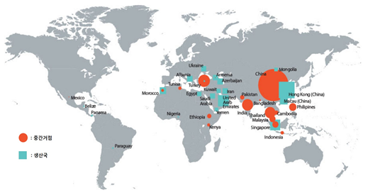 - (개요) 동 보고서는 2016년 발표된 보고서 ‘위조 상품의 거래: 경제적 효과 분석’2)의 후속으로, 위조품의 경우 매우 복잡한 무역 경로를 통해 거래되고 중간거점(transit points)을 거치면서 서류 위조, 재포장 등의 행위가 이루어져 대부분의 세관에서 위조품을 적발하기 힘들어지는 문제가 발생함 ∙ 이에 EUIPO 등 기관은 위조품 무역을 보다 효율적이고 용이하게 근절하기 위하여 위조품 무역과 관련해 특히 취약한 10개 산업분야3)와 위조품 주요생산국 및 주요중간거점에 대해 조사함 - (주요내용) 동 보고서는 산업분야별로 위조품 주요생산국 및 주요중간거점을 분석하고 있으며, 그 주요내용은 다음과 같음 ∙ 10개 산업분야 전체를 대상으로 위조품 무역을 조사한 결과, 2013년에 총 2,840억 달러 규모의 위조품이 거래된 것으로 드러났으며, 이는 세계 위조품 무역량(추정치)의 과반을 차지하는 것으로 드러남 ∙ 중국은 10개 산업분야 중 9개 분야에서 최대 위조품 생산국으로 드러났으며, 그 밖에 여러 아시아권 국가(인도, 태국, 터키, 말레이시아, 파키스탄, 베트남)가 다양한 분야의 위조품 생산지로 조사되었고, 특히 터키는 가죽제품, 식료품 및 화장품 등 분야의 주요생산국으로 역할하는 것으로 드러남 ∙ 홍콩(중국), 아랍 에미리트, 싱가포르가 위조품이 거래되는 주요중간거점으로 역할하고 있으며, ⅰ) 아랍 에미리트, 사우디아라비아, 예맨 등 중동국가는 아프리카로, ⅱ) 알바니아, 이집트, 모로코, 우크라이나는 유럽연합(EU)으로, ⅲ) 파나마는 미국으로 유입되는 위조품 무역 주요중간거점으로 조사됨