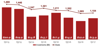 • 동 보고서의 결과에 따르면, 미국 벤처 캐피탈 투자 총액이 2017년 1/4분기에 반등하였으나 최고치를 기록했던 2015년 비해 여전히 낮은 수준을 기록함 - (전체규모) 2017년 1/4분기에 139억 달러(1,104건)의 벤처 캐피탈을 투자하여, 2016년 4/4분기에 비해 벤처 캐피탈 투자 총액은 15% 증가하고 거래 건수는 2% 증가를 기록함