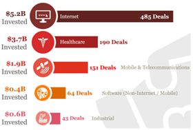 - (분야별) 인터넷 분야는 2017년 1/4분기에 총액 52억 달러(485건)로 1위를 기록하였으며, 의료 분야는 총액 37억 달러(190건)로 2위를 기록함