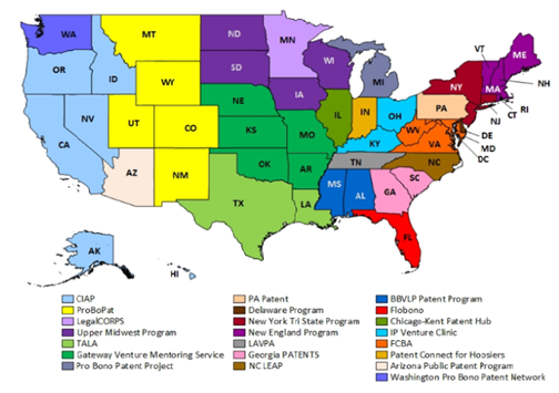 - (특허 프로보노 프로그램) 2011년 USPTO는 미국 50개 주에서 그 지역의 발명가와 법률가를 매칭하여 적은 비용으로 발명가의 특허 출원 및 등록을 지원하는 특허 프로보노 프로그램을 시작함 ∙ 이 프로그램을 통해 현재 미국 전역에 22개의 특허허브(patent hub)가 갖추어져 그 지역의 변호사, 변호사협회, 또는 로스쿨이 이를 운영하고 있으며, 하나의 허브가 한 개의 주 또는 복수의 주를 관장하고 있음