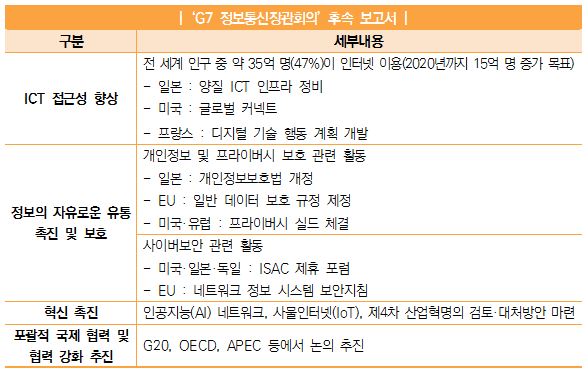 • 2017년 3월 31일, 일본 총무성(総務省)은 2016년 4월 개최된 ‘G7 정보통신장관회의’1)에서 논의된 내용에 대해 G7 각국의 대처 등을 정리한 후속 보고서를 발표함