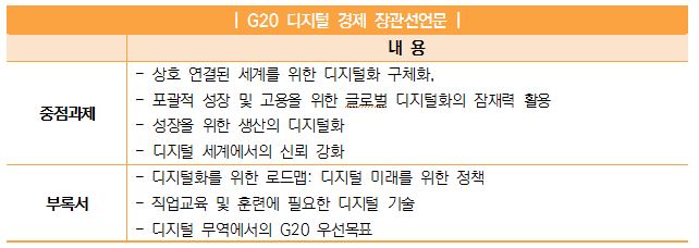 • 2017년 4월 7일, 독일 연방경제에너지부(BMWi)1)는 G202) 디지털 장관회의에서 디지털 경제 활성화, 디지털화 로드맵, 지식재산과 혁신 등을 내용으로 하는 ‘G20 디지털 경제 장관선언문(G20 Digital Economy Ministerial Declaration)’이3) 채택되었다고 발표함