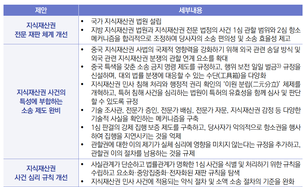 - (배경) 중국 시진핑(习近平) 국가주석은 “지식재산권 사건의 규율에 부합하는 소송 규범을 연구 및 제정할 것”을 지시하였고, 이는 ‘지식재산권 강국 건설 강요(2021-2035년)’, ‘제14차 5개년 규획’, ‘과학기술 체제 개혁 3년 계획안’ 등의 중점업무에 반영된 바 있음 - (주요내용) 중국 시진핑 국가주석의 지시를 관철하기 위해 타오카이위안 위원은 2025년 중국 양회2) 기간(3월 4일-3월 14일) 동안 입법 기관이 지식재산권 사건의 규율에 부합하는 ‘지식재산권 소송 특별절차법’을 조속히 연구·제정할 것을 권고했으며, 구체적으로 다음의 내용을 포함할 것을 제안함 ![]() 1) 중국 인민정치협상회의(人民政治协商会议)는 중국 공산당이 지도하는 정치자문기구로 국가와 지방의 정책 방침과 정치·경제·문화·사회 생활의 중요 문제에 대해 협상하는 등의 기능을 함(출처: 중국 신화망). 2) 중국 양회(兩會)는 ‘중국인민정치협상회의(中國人民政治協商會議)’와 ‘전국인민대표대회(全國人民代表大會)의 2개 회의로 구성된 중국의 연례 정치행사로서, 전년도의 업무성과를 점검하고 당해 연도의 국가정책을 공표하며 정부 인선을 확정하는 자리임(출처: 외교안보연구소). 3) 행위 보전 일일 벌금(行爲保全日罰金)은 중국 민사소송법상 ‘행위 보전 조치’를 위반했을 경우 부과하는 하루 단위의 벌금 제도를 말함(출처: 주중화인민공화국대한민국 대사관). |