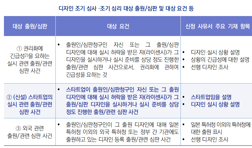 ∙ 2025년 4월 1일, 일본 특허청(JPO)은 디자인 조기 심사(早期審査)·조기 심리(早期審理) 대상에 스타트업의 실시 관련 출원1)이 포함 된다고 발표함