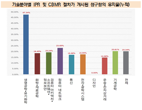 - (대상) 2016년 11월에 최종심결이 내려진 당사자계 무효심판(Inter Partes Review, IPR)1) 및 영업방법 특허에 대한 무효심판(Covered Business Method Patents Review, CBMR)2) 총 75건을 대상으로 분석함 - (사건 기준) 총 75건의 최종심결 중 절차 개시가 거절된 사건은 49건(65.33%), 절차가 개시된 모든 청구항이 유효로 결정된 사건은 18건(24%), 청구가 일부 인용3)된 사건은 8건(10.67%)을 기록함 - (청구항 기준) PTAB은 최종심결에서 절차가 개시된 청구항 총 1,133개 중 806개(71.14%)에 대하여 무효, 327개(28.86%)에 대하여 유효하다고 판단하였으며, 절차 중 특허권자의 정정청구 또는 청구항 포기로 무효가 된 청구항은 없었음 - (기술분야 기준) IPR 및 CBMR 절차가 개시된 청구항의 기술분야별 누적 유지율은 아래의 그래프와 같음(2016년 12월 1일 기준) ![]() 1) IPR은 제3자가 특허등록일로부터 9개월이 경과한 후에 PTAB에 심판을 청구하여 해당 특허의 유효성을 다툴 수 있도록 허용한 제도임. 2) CBMR은 등록 후 무효심판(Post-Grant Review, PGR)에 대한 특칙으로, 무효사유가 있는 특정 영업방법 특허에 관해서는 기한에 제한 없이 PTAB에 무효심판을 청구할 수 있도록 하는 한시적 제도(시행일부터 8년 후 폐지)임. PGR은 제3자가 특허등록일로부터 9개월 이내에 PTAB에 심판을 청구하여 해당 특허의 유효성을 다툴 수 있도록 허용하고 있음. 3) 최소한 1개의 청구항이 유효한 특허로 인정받거나 반대로 최소한 1개의 청구항이 무효로 인정된 사건을 의미함. |