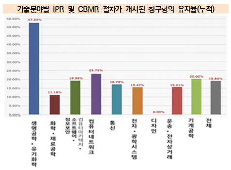 - (대상) 2016년 10월에 최종심결이 내려진 당사자계 무효심판(Inter Partes Review, IPR) 1)및 영업방법 특허에 대한 무효심판(Covered Business Method Patents Review, CBMR) 2)총 49건을 대상으로 분석함 - (사건 기준) 총 49건의 최종심결 중 절차 개시가 거절된 사건은 31건(63.27%), 절차가 개시된 모든 청구항이 유효로 결정된 사건은 13건(26.53%), 청구가 일부 인용3)된 사건은 5건(10.2%)을 기록함 - (청구항 기준) PTAB은 최종심결에서 절차가 개시된 청구항 총 938개 중 660개(70.36%) 청구항은 무효, 278개(29.64%) 청구항은 유효하다고 판단하였으며, 절차 중 특허권자의 정정청구 또는 청구항 포기로 무효가 된 청구항은 없었음 - (기술분야 기준) IPR 및 CBMR 절차가 개시된 청구항의 기술분야별 누적 유지율은 아래의 그래프와 같음(2016년 11월 1일 기준) ![]() 1) IPR은 제3자가 특허등록일로부터 9개월이 경과한 후에 PTAB에 심판을 청구하여 해당 특허의 유효성을 다툴 수 있도록 허용한 제도임. 2) CBMR은 등록 후 무효심판(Post-Grant Review, PGR)에 대한 특칙으로, 무효사유가 있는 특정 영업방법 특허에 관해서는 기한에 제한 없이 PTAB에 무효심판을 청구할 수 있도록 하는 한시적 제도(시행일부터 8년 후 폐지)임. PGR은 제3자가 특허등록일로부터 9개월 이내에 PTAB에 심판을 청구하여 해당 특허의 유효성을 다툴 수 있도록 허용하고 있음. 3) 최소한 1개의 청구항이 유효한 특허로 인정받거나 반대로 최소한 1개의 청구항이 무효로 인정된 사건을 뜻함. |