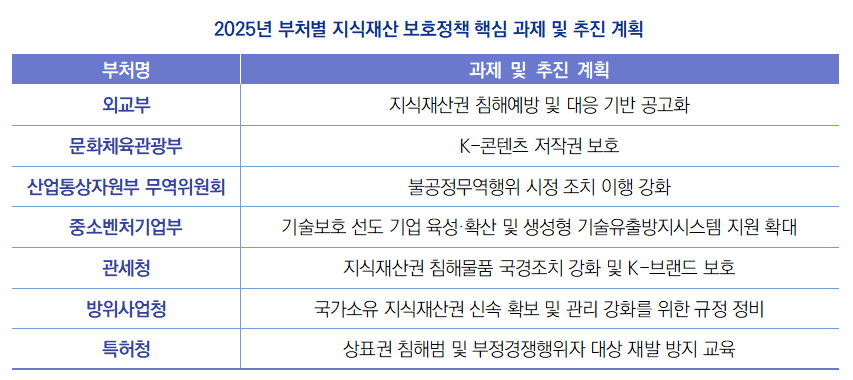 ∙ 2025년 3월 26일, 대통령 소속 국가지식재산위원회(이하, 지재위)는 지식재산 보호 유관 부처가 참여하는 2025년 제1차 ‘지식재산 보호정책 협의회’를 개최함