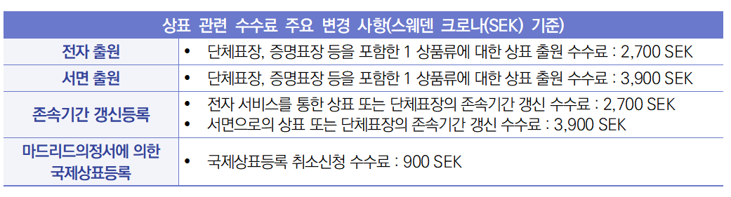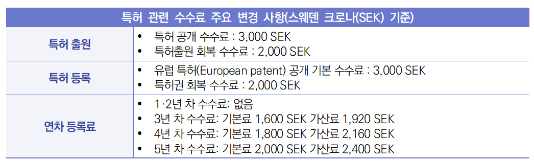 | 스웨덴 특허청, 특허 및 상표 관련 일부 수수료 변경 사항 발표 |