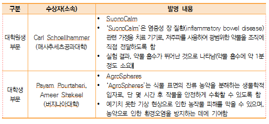 - (배경 및 목적) CIC는 대학(원)생에 의한 발명, 발견, 혁신에 대한 공로를 인정하고, 이를 표창하기 위하여 마련된 NIHF의 프로그램 중 하나로, NIHF와 함께 USPTO·애브비재단(AbbVie Foundation)이 공동 주최하고 있음 ∙ CIC는 1990년부터 매년 개최되고 있으며, CIC에서의 수상은 미국에서 가장 혁신적인 학생으로 인정받는 동시에 그들의 아이디어와 프로젝트 또한 가장 혁신적임을 인정받는 것으로 여겨지고 있음 - (주요내용) CIC는 수상후보작의 전시회(Expo)와 시상식으로 구성되었으며, 최우수 발명으로 선정된 개인 또는 팀에게는 10,000달러의 상금과 상장이 수여됨 ∙ 전시회는 수상후보자 28인(대학원생 부문 6개팀, 대학생 부문 5개팀)2)이 자신의 발명을 시연한 후, USPTO의 특허·상표 심사관, 특허 변호사, 후원사, 지식재산권 단체의 회원, 일반 참여자 등과 질의 및 토론을 하는 방식으로 진행됨 ∙ 대학원생 및 대학생 부분에서 최우수상을 받은 수상자 및 관련 발명 내용은 다음과 같음 ![]() 1) 1973년 USPTO와 국가지식재산위원회(The National Council of Intellectual Property)가 발명가의 명예와 업적을 기리기 위하여 만든 단체임. 2) 이에 대한 상세한 정보는 다음의 웹사이트 참조: http://collegiateinventors.org/current-finalists |