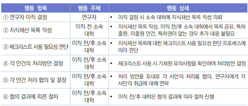 - (배경) 일본 내각부 지식재산전략본부는 대학 등에서 연구자 퇴직 시 지식재산권 취급에 관해 검토하고 이에 대한 가이드라인을 마련하고자 제1차(’24년 12월) 및 제2차(’25년 2월) 회의를 개최한 바 있음 - (주요내용) 제3차 회의는 대학 등에서 연구자 퇴직 후 이직 시 예상되는 지식재산권 처리(귀속 유형) 예시, 지식재산권 처리 대응 절차 예시, 지식재산 목록에 대한 체크리스트 사용 필요성 판단 절차 등에 대해 논의함 (1) 대학 등에서 연구자 이직 시 예상되는 지식재산권 처리(귀속 유형) 예시 ∙ ① 권리 양도(권리 귀속: 이직 후 소속 대학), ② 권리 유지(권리 귀속: 이직 전 소속 대학), ③ 권리 일부 양도(권리 귀속: 이직 전/후 소속 대학), ④ 권리 포기(권리 귀속: 없음), ⑤ 권리 반환(권리 귀속: 연구자) (2) 대학 등에서 연구자 이직 시 지식재산권 처리 대응 절차 예시 ∙ 대학 등에서 연구자의 이직 시 지식재산권 처리 대응 흐름은 다음과 같음 ![]() (3) 지식재산 목록에 대한 체크리스트 사용 필요성 판단 절차 ∙ 이직 전/후 소속 대학은 지식재산 목록에 대해 체크리스트 사용 필요성 판단 시 고려해야 할 요소1)가 있는 경우 체크리스트 사용이 권장되며, 고려해야 할 요소가 없는 경우에도 이직 전후 소속 대학별 지식재산권 관리능력, 비용 및 인센티브 측면에서 체크리스트 사용이 필요한지 종합적으로 검토해야 함 1) 고려해야 할 요소로는 스타트업이 설립되어 사업화되어 있는 경우, 고액의 실시료 수입이 있는 경우, 발명자 인정에 다툼이 있는 경우, 해당 연구자가 해외에서 전입한 경우, 해당 연구자가 해외로 전출한 경우, 이직 전후로 연구를 계속하는 경우, 미출원 안건이 있는 경우가 있음(출처: 일본 내각부). |