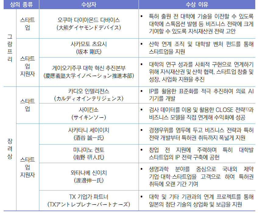 -(배경) IP BASE AWARD는 JPO가 스타트업 및 스타트업 지원자(支援者) 중 지식재산권(IP)관련 성과가 우수한 최고의 참가자(회사·개인)를 선정하여 2019년부터 수여하고 있는 IP 상임 -(주요내용) 동 어워드의 스타트업 부문 수상자는 서류심사와 공청회 심사(ヒアリング審査)를 통과한 최종 후보 6개사 가운데 선정되었으며, 각 부문의 자세한 수상내역은 다음과 같음 ![]() 1) 자사가 독점하는 핵심 영역을 클로즈 영역으로 설정하고 핵심 영역에 대해 지식재산권 등으로 보호하는 전략을 의미함(출처: 일본 문부과학성). |
