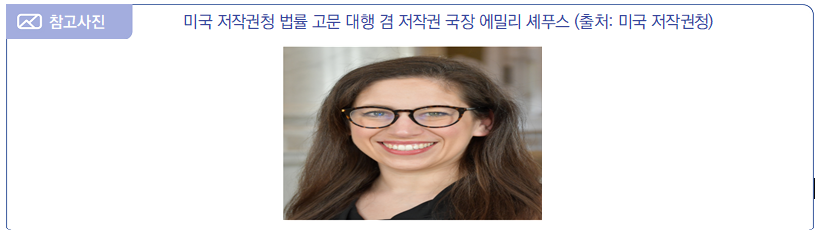 - (주요내용) 동 발표는 에밀리 셰푸스의 학력, 경력 및 주요 업적 등에 대한 내용을 포함함 (1) 에밀리 셰푸스 학력 ∙툴레인 대학교(Tulane University)를 최우등으로 졸업하고, 예일 로스쿨(Yale Law School)에서 법학전문학위(JD)를 취득함 (2) 에밀리 셰푸스 경력 ∙미국 저작권청에 합류하기 전, 브레드호프&카이저(Bredhoff & Kaiser)社에서 노동 및 고용 법률을 다루는 업무를 하였고, 제너&블록(Jenner&Block) 로펌(law firm)에서는 파트너로 활동하였음 ∙또한, 제너&블록 로펌에서 콘텐츠, 미디어 및 엔터테인먼트 파트의 일원으로서, 음악 라이선싱, 요율 설정(rate-setting), 저작권 침해 문제를 포함하여 저작권 분야에서 다양한 전문성을 쌓은 바 있음 ∙미국 뉴욕 동부지구 연방지방법원(U.S. District Court for the Eastern District of New York)에서 로클럭(law clerk)으로도 근무한 경험이 있음 ∙2023년 3월부터는 미국 저작권청에 합류하여 부 법률 고문(deputy general counsel)으로 근무해 옴 (3) 에밀리 셰푸스 주요 업적 ∙미국 저작권법(DMCA) 제 1201조 규칙 제정(rulemaking)에 공헌함 ∙또한, 저작권 및 인공지능에 관한 보고서(Report Copyright and Artificial Intelligence) 3개 시리즈를 발간하였고 중요한 저작권 소송 문제에서 자문을 제공하는 등 저작권청이 AI 이니셔티브(initiative)를 확립하는데 기여함