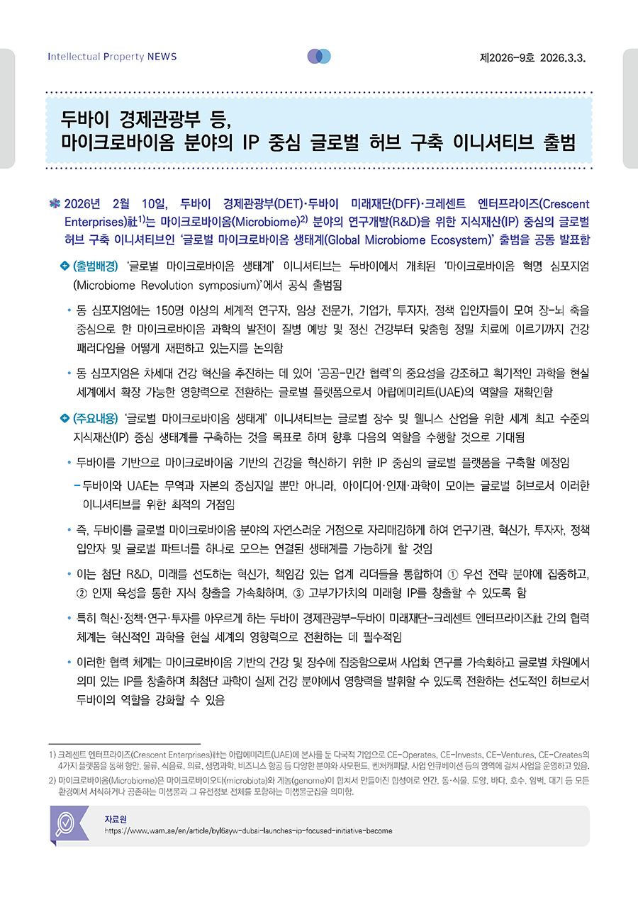 두바이 경제관광부 등, 마이크로바이옴 분야의 IP 중심 글로벌 허브 구축 이니셔티브 출범