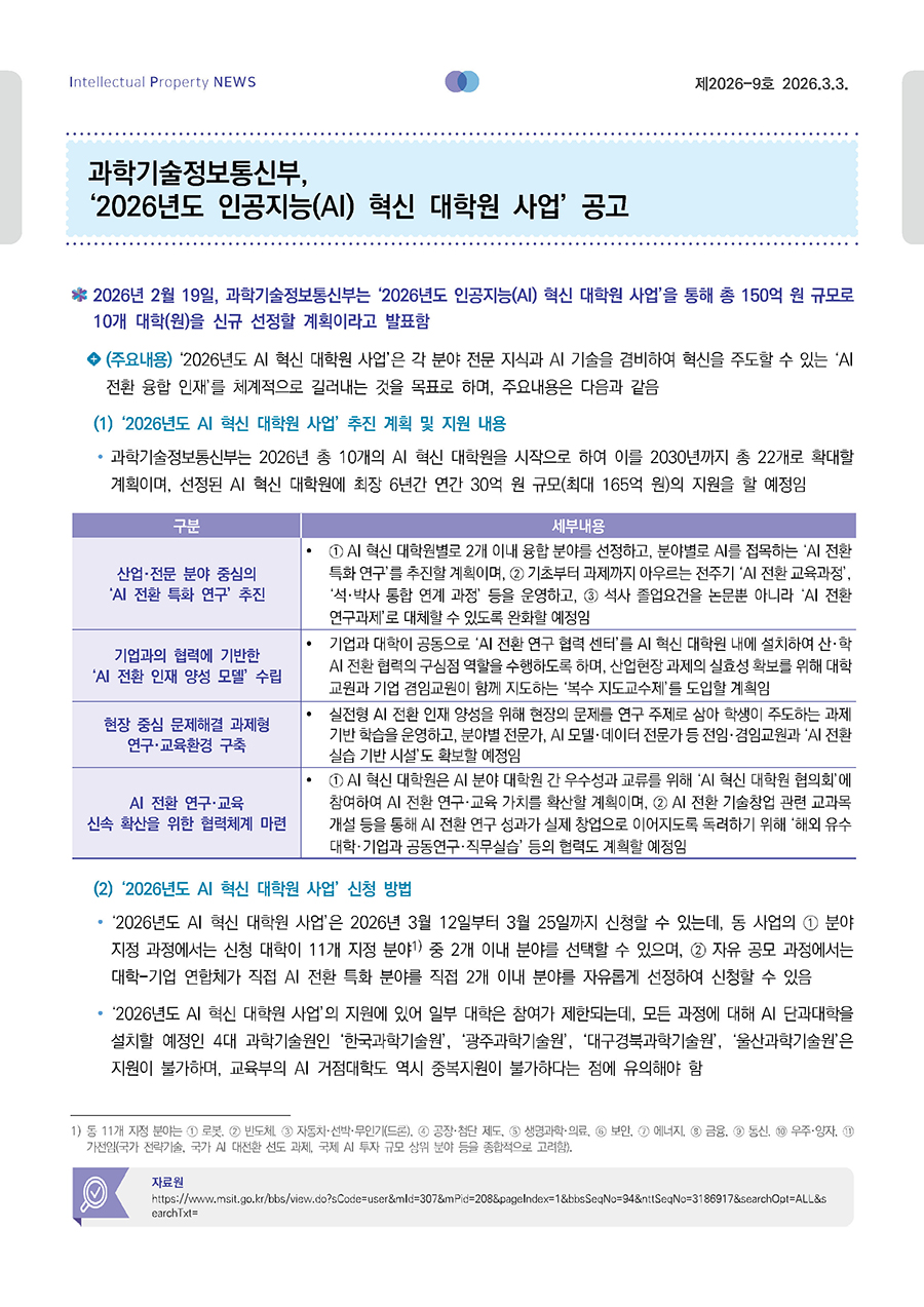 과학기술정보통신부, ‘2026년도 인공지능(AI) 혁신 대학원 사업’ 공고