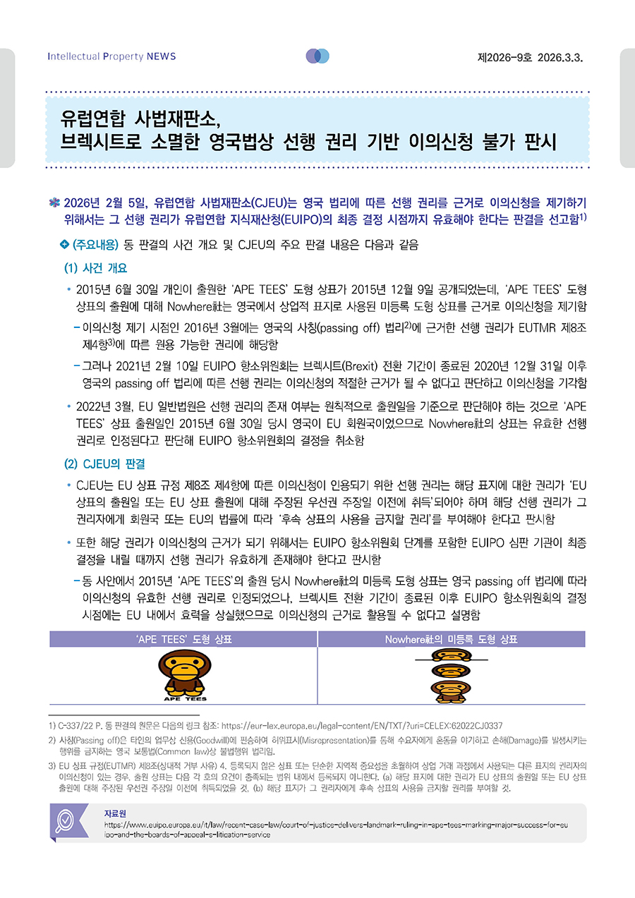 유럽연합 사법재판소, 브렉시트로 소멸한 영국법상 선행 권리 기반 이의신청 불가 판시