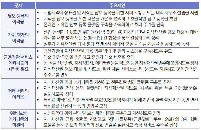 - (배경) 2024년 중국 금융기관은 2023년 대비 33.4% 증가한 총 약 2,555억 7,000만 위안(한화 약 51조 2,086억 원)의 지식재산권 담보 대출을 발행함 ∙ 하지만 일부 지역 및 분야에서는 여전히 지식재산권 금융 발전을 제약하는 다양한 어려움과 장애물이 존재함에 따라, 중국 국가금융감독관리총국 등은 지식재산권이 결집되어 있고 업무 기반이 우수한 지역을 선정하여 지식재산권 금융 생태계 종합 시범 사업을 실시하기로 결정하고 관련 업무 방안을 발표함 - (주요내용) 중국 국가금융감독관리총국 등은 동 업무 방안에서 ‘지식재산권’이라는 핵심 요소를 중심으로 ‘문제’를 해결해 나가는 접근 방식을 통해 등록, 평가, 보상 등의 영역에 대한 맞춤형 정책 조치를 제안함 ![]() 1) 베이징시(北京市), 상하이시(上海市), 장쑤성(江苏省), 저장성(浙江省), 광동성(广东省), 쓰촨성(四川省), 선전시(深圳市), 닝보시(宁波市). |
