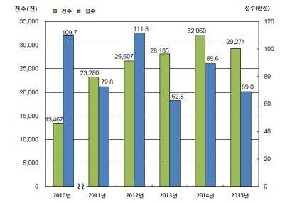 〇 (주요내용) 지식재산침해물품 수입금지 현황은 다음과 같음 - (수입금지건수) 수입금지 건수는 29,274건으로 전년 대비 8.7 % 감소한 수치로, 이는 과거 최대 건수를 기록한 2014년에 이어 2번째로 높은 수준이었으며, 수입금지 물품 건수는 689,621점으로 전년 대비 23 % 감소함 - (수입국별 수입금지건수) 수입국별 수입금지 건수는 중국이 26,670건으로, 전체의 91.1 %를 차지하였으며, 전년 대비 9.8 % 감소함 - (지식재산별 수입금지건수) 지식재산별 수입금지 건수는 위조품 등의 상표권 침해물품이 656,853건으로 전체의 95.2 %(전년 대비 8.9 % 감소)를 차지하였으며, 저작권 침해물품이 27,948건(전년 대비 20.4 % 감소), 특허권 침해물품이 932건(전년 대비 183.3 % 증가)임 - (품목별 수입금지건수) 품목별 수입금지 건수는 지갑이나 핸드백 등의 가방류가 11,463건(전체의 35.2 %), 자켓과 셔츠 등 의류가 4,610건(전체의 14.2 %), 운동화 등 신발류가 3,875건(전체의 11.9 %)임 | 2015년도 세관의 지식재산침해물품 수입금지 현황 | ![]() |