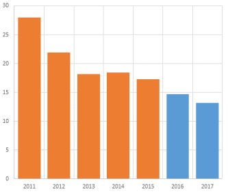 - 아래의 그래프에서 2011년 - 2015년(오렌지색 그래프)은 실제 수치이며, 2016년 – 2017년(파란색 그래프)은 USPTO의 목표치를 나타냄 - Patently-O는 2011년부터 최초심사통지까지의 소요기간이 현저하게 감소하였으며, USPTO는 2016년과 2017년에도 심사기간 단축을 위해 지속적으로 공격적인 목표를 설정하고 있다고 설명함1) - 동 발표의 특허출원은 실용특허(utility patent) 출원 뿐만 아니라 디자인특허(design patent) 출원 및 식물특허(plant patent) 출원 모두를 포함하고 있음2) - 특허 전문가들은 당분간 최초심사통지 소요기간의 감소 추세가 지속될 것이라고 전망함 | USPTO 최초심사통지 소요기간 추이 | ![]() 1) 2015년 12월 15일, USPTO가 발표한 「2015년 업무성과 보고서(2015 Performance and Accountability Report)」에 따르면 2015년 최초심사통지까지의 평균 소요기간은 17.3개월을 기록한 바 있음. 2) 다만, 디자인특허와 식물특허의 출원 시 최초심사통지까지의 소요기간은 실용특허보다 짧음. |