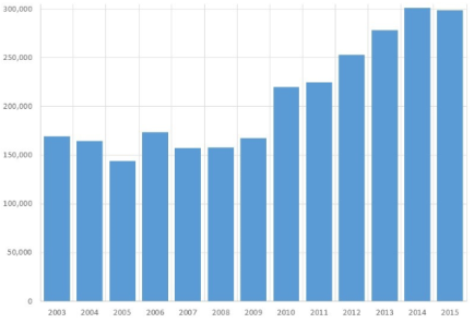 - 2015년 미국 특허상표청(USPTO)에 등록된 실용특허 건수는 298,407건으로, 30만 건 이상의 실용특허가 등록되었던 2014년에 비하여 다소 감소함 - 2000년대 후반부터 지속적인 증가 추세를 보이던 실용특허 등록 건수는 2015년에 처음으로 전년 대비 감소한 것으로 나타남 - Patently-O는 미국 USPTO가 급진적으로 정책을 변경하지 않는 한 향후 몇 년 동안 연간 30만 건 정도의 실용특허가 등록될 것으로 예측함 | 2003 – 2015년 미국 실용특허 등록 건수 추이 |