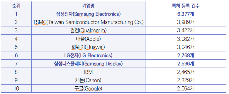 | 미국 IFI CLAIMS社, 미국 특허 등록 상위 50개 기업 및 빠르게 성장하는 기술 10개 발표 |