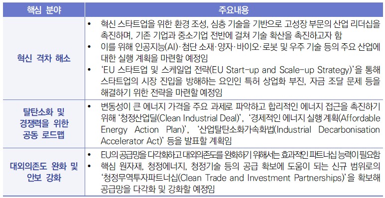∙ 2025년 1월 29일, 유럽연합 집행위원회(EC)는 향후 5년 간 EC의 업무 추진을 위한 전략적이고 명확한 프레임워크를 제공하는 경쟁력 강화 정책인 ‘경쟁력 나침반(Competitiveness Compass)’1)을 발표함