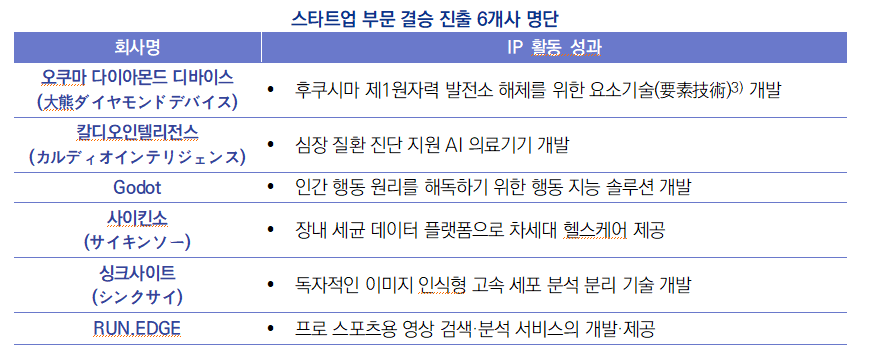∙ 2025년 2월 3일, 일본 특허청(JPO)은 제6회 IP BASE AWARD 스타트업 부문 결승 진출 6개사를 선정하였다고 발표함