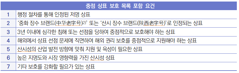 - (주요내용) 동 지침은 총 15개 조로 구성되며, 구체적으로 지침 목적 및 적용 범위, 중점 상표의 개념, 중점 상표 보호 목록에 포함되기 위한 요건 등이 포함됨 (1) 지침 제정 목적 ∙ 동 지침은 중점 상표의 행정 보호를 위한 업무 목록을 구축하여 중점 상표에 대한 부서 간 및 지역 간의 행정 보호와 권리 보호 업무를 강화하고 산시성 상표의 행정 보호 효율성을 제고함과 동시에 우수한 비즈니스 환경을 조성하는 것을 목표로 함 (2) 중점 상표의 개념(제1조) ∙ 중점 상표란 산시성 내에서 등록되거나 운영 중인 기업(단체)과 자연인이 보유한 등록 상표 중 산시성 내에서 ① 높은 지명도(知名度)를 가지고, ② 시장 영향력이 크며, ③ 침해 가능성이 높고, ④ 보호를 강화할 필요가 있는 상표를 의미함 (3) 산시성 지식산권국의 역할(제2조 및 제3조) ∙ 동 지침은 산시성 내에서 등록되었거나 실제 사용되고 있는 상표에 적용되며, 산시성 지식산권국(陕西省 知识产权局)은 중점 상표 보호 목록을 효과적이고 시의적절하게 작성, 관리 및 업데이트할 책임이 있음 (4) 중점 상표 보호 목록에 포함될 수 있는 상표(제4조) ∙ 이하의 요건을 충족하는 등록 상표는 중점 상표 보호 목록에 포함될 수 있음 ![]() 1) 동 지침의 원문은 다음의 링크 참조: https://www.sxlib.org.cn/zt/zscqzx/zcfg/202502/t20250206_1152243.htm 2) 장수 브랜드(老字号)란 오랜 역사를 가지고 대대로 계승되어 내려오는 제품, 기술 또는 서비스를 갖추고 뚜렷한 중국 및 지역의 전통문화 배경과 깊은 문화적 소양을 지니어 사회에서 널리 인정받아 좋은 평판을 형성하는 브랜드를 말함(출처: 중국 상하이시). |