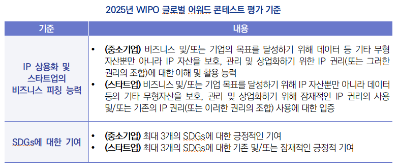 - (주요내용) WIPO 글로벌 어워드는 지식재산(IP)을 스마트하게 활용 및 상업화하고 혁신과 창의성을 통해 사회에 긍정적인 기여를 하는 우수 기업 및 개인에게 수여되는 상임 ∙ (대상) WIPO의 193개 회원국 중 하나에 소재한 중소기업 및 스타트업으로 혁신적이고 창의적인 제품·서비스를 상용화한 중소기업과 사업 초기 단계에서 지식재산권을 비즈니스에 접목하여 사업화 가능성을 인정받은 스타트업이 대상이며, 2025년에는 여성 및 청년 기업가에게도 특별 표창이 수여될 예정임 ∙ (절차 및 일정) 참가 신청(2025년 1월 15일부터 3월 31일까지) → 후보자 선정(2025년 4월~5월 중) → 수상자 및 특별 표창자 선정(2025년 6월 중) → 시상식 개최(2025년 7월 중) ∙ (수상혜택) ➀ 다양한 플랫폼을 통해 국제적인 홍보 제공, ➁ 스위스 제네바에서 개최되는 시상식 및 기타 네트워킹 행사에 참석, ➂ 맞춤형 IP 멘토링 프로그램 제공 등 ∙ (평가기준) IP 상용화 및 스타트업의 비즈니스 피칭 능력, 지속가능발전목표(SDGs)1)에 대한 기여 ![]() 1)2015년 제70차 UN 총회에서 2030년까지 달성하기로 결의한 의제인 지속가능발전목표(Sustainable Development Goals, SDGs)는 지속가능발전의 이념을 실현하기 위한 인류 공동의 17개 목표임. 구체적으로 빈곤층 감소와 사회안전망 강화, 식량안보 및 지속가능한 농업강화, 건강하고 행복한 삶 보장, 모두를 위한 양질의 교육, 성평등 보장, 건강하고 안전한 물관리, 에너지의 친환경적 생산과 소비, 좋은 일자리 확대와 경제성장, 산업의 성장과 혁신 활성화 및 사회기반시설 구축, 모든 종류의 불평등 해소, 지속가능한 도시와 주거지 조성, 지속가능한 생산과 소비, 기후변화와 대응, 해양생태계 보전, 육상생태계 보전, 평화·정의·포용, 지구촌 협력 강화 등이 있음(출처: 국가 지속가능 발전 포털). |