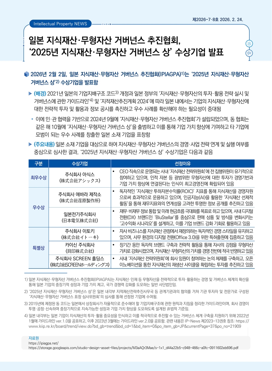 | 일본 지식재산·무형자산 거버넌스 추진협회, ‘2025년 지식재산·무형자산 거버넌스 상’ 수상기업 발표 |