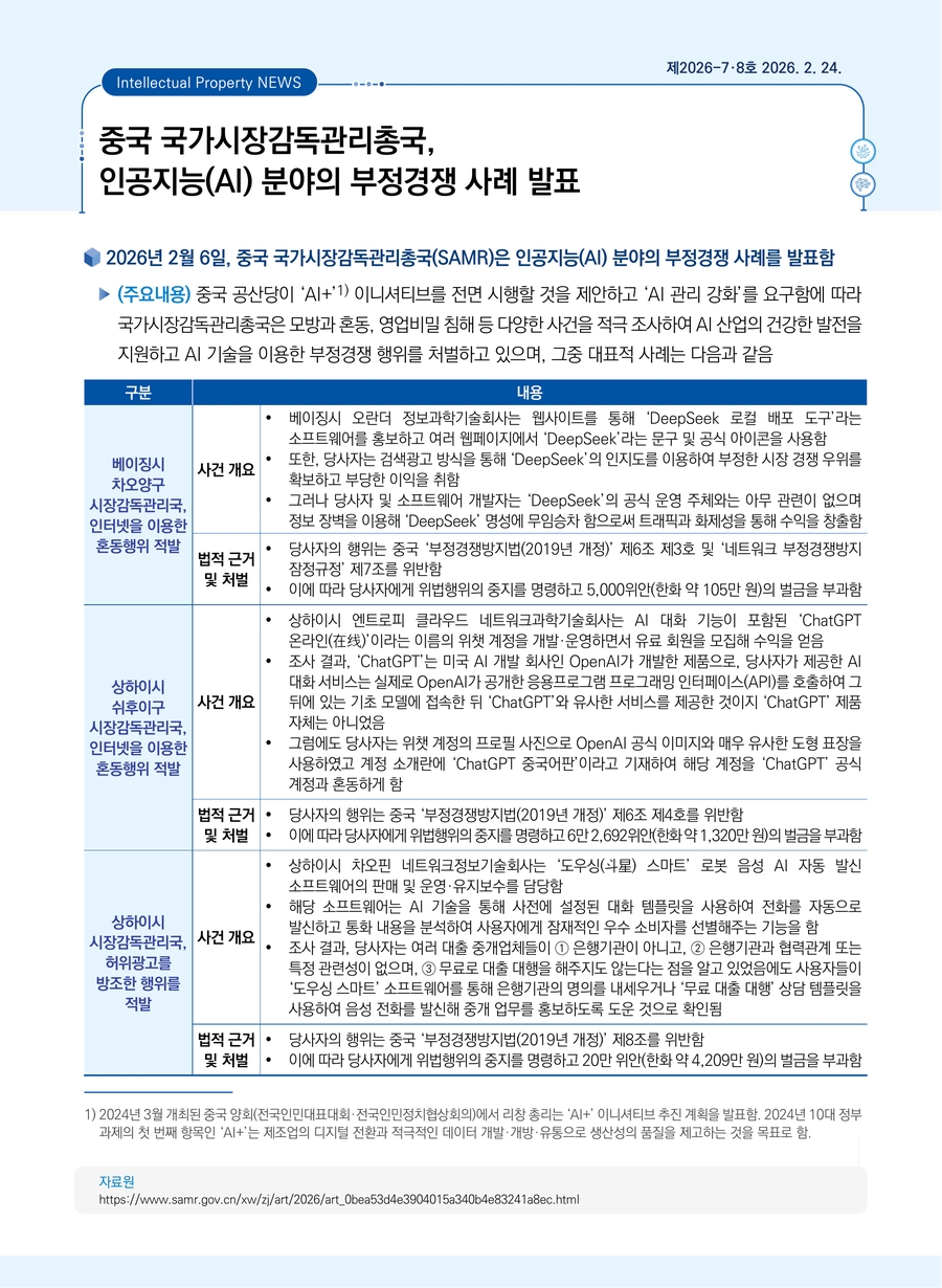 중국 국가시장감독관리총국, 인공지능(AI) 분야의 부정경쟁 사례 발표