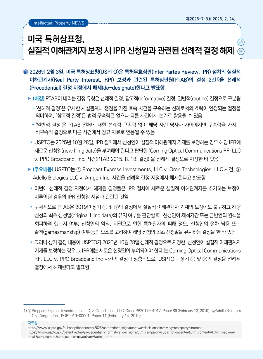 미국 특허상표청, 실질적 이해관계자 보정 시 IPR 신청일과 관련된 선례적 결정 해제