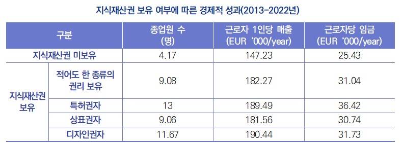 - (배경) 양 기관은 2013년 지식재산권(특허, 상표, 디자인)의 기업의 성과에 대한 기여도를 분석한 연구보고서를 발간한 이래 3년마다 개정판을 발표해 옴 - (주요내용) 동 보고서는 지식재산권을 보유한 기업과 그렇지 않은 기업의 경제적 성과를 분석하기 위한 것으로 2013년부터 2022년까지 119,000개 유럽 기업을 대상으로 조사함 ∙ 지식재산권 보유 기업은 유럽 기업의 직원 1인당 매출은 지식재산권 미보유 기업보다 평균 23.8% 높은 것으로 나타남 ∙ 또한 지식재산권 보유 기업은 지식재산권 미보유 기업보다 평균 22.1% 높은 임금을 지급하고 있음 ∙ 특허권을 소유한 경우 직원 1인당 평균 28,7% 매출이 증가했으며 약 43,3%의 임금이 상승된 것으로 나타남 ∙ 대기업은 약 50% 이상이 지식재산권을 보유하고 있던 반면 중소기업은 약 10%만이 지식재산권을 보유하고 있음 ∙ 지식재산권 보유 기업은 정보통신(14.8%), 제조업(14.2%), 상수도 및 폐기물 처리(12.0%), 과학 및 기술 활동(10.7%), 도소매업 분야에서 더 많이 분포하고 있음 ![]() 1) 동 보고서의 원문은 다음의 링크 참조: https://euipo.europa.eu/tunnel-web/secure/webdav/guest/document_library/observatory/documents/reports/2025_IPRs_firm_performance_in_the_EU/IPRs_firm_performance_in_the_EU_FullR_en.pdf |