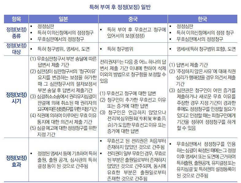 - (배경) JPO는 중국 국가지식산권국(CNIPA), 한국 특허청(KIPO)과 심판분야의 협력 촉진, 정보 교환, 제도운영 차이점을 분석하여 상호 이해를 심화하는 것을 목적으로 2013년부터 심판 공동 전문가 그룹 회의를 개최하여 각국의 심판제도 및 운영에 대한 비교 연구를 진행함 - (주요내용) 동 보고서의 ‘특허 부여 후 정정요건’에 대한 주제는 2023년 12월 제10차 심판 공동 전문가 회의에서 제안된 것으로 주요내용은 다음과 같음 ![]() 1) 동 보고서의 원문은 다음의 링크 참조: https://www.jpo.go.jp/news/kokusai/nityukan/document/nicyukan_shinpan_hikakuken/comparative-study-2025_ja.pdf 2) 여기서 말하는 전리(专利)는 중국의 특허를 뜻하는 말로 발명특허, 실용신안특허, 디자인특허를 포함하는 개념임.