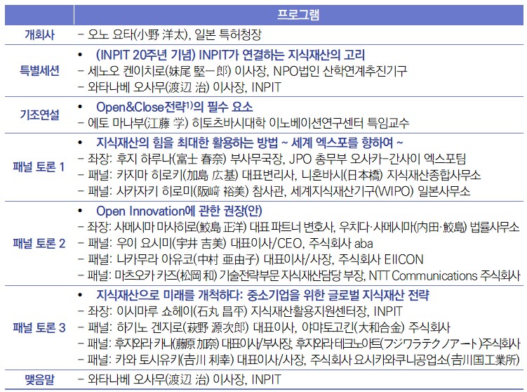 - (주요내용) 동 포럼은 INPIT가 2015년부터 JPO와 공동으로 주최하고 있으며 자세한 내용은 다음과 같음 ∙ (목적) 일본 국내외 경영 및 지식재산 전략에 관한 최신 주제를 소개하고 경영 전략과 연계하여 지식재산 전략 구축에 필요한 정보를 제공함 ∙ (일시) 2025년 2월 21일(금), 10:00 ~ 17:15 ∙ (장소) 칸다 스퀘어(도쿄도 지요다구 칸다니시키초 2-2-1 스퀘어 홀, 온·오프라인 하이브리드 개최) ![]() 1) Open&Close 전략이란 기술을 공개하는 오픈 전략과 자사가 독점하는 핵심 영역을 클로즈 영역으로 설정하고 핵심 영역에 대해 지식재산권 등으로 보호하는 클로즈 전략을 의미함(출처: 일본 문부과학성). |