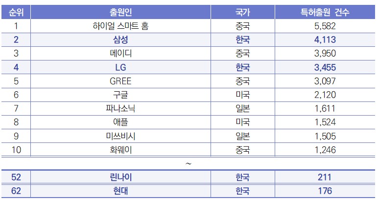 - (개요) 스마트 홈(智慧家庭)은 주택을 기본 플랫폼으로 하여 최신 통합 배선 기술, 초고속 네트워크 통신 기술, 첨단 안전 기술 및 자동화 제어 기술, 고화질 오디오 및 비디오 등을 통해 가정의 다양한 시설을 지능적으로 통합하고 친환경·에너지 절약을 위한 주거환경을 실현하는 기술임 ∙ 글로벌 시장조사 및 컨설팅 기관인 IDC(International Data Corporation)가 발표한 ‘2025년 중국 스마트 홈 시장에 대한 10대 통찰력(2025年中国智能家居市场十大洞察)’ 보고서에 따르면, 2025년 중국 스마트 홈 관련 장비 출하량은 전년 대비 7.8% 증가한 2억 8,100만 대에 이를 것으로 전망됨 - (주요내용) IPR Daily는 스마트 홈과 관련된 키워드 및 분류번호를 기준으로 2024년 1월 1일부터 12월 31일까지 전 세계적으로 출원 및 공개된 스마트 홈 특허에 대한 통계를 수집함 ∙ 그 결과, 하이얼 스마트 홈(중국)이 1위(5,582건)를 기록했고, 삼성(한국)이 2위(4,113건), 메이디(중국)가 3위(3,950건), LG(한국)가 4위(3,455건), GREE(중국)가 5위(3,097건)를 차지함 ∙ 뒤이어, 구글(미국)이 6위(2,120건), 파나소닉(일본)이 7위(1,611건), 애플(미국)이 8위(1,524건), 미쓰비시(일본)가 9위(1,505건), 화웨이(중국)가 10위(1,246건)를 기록함 ∙ 그 밖에 한국 기업은 린나이와 현대가 각각 52위(211건), 62위(176건)에 랭크됨 ![]() |