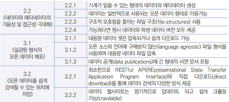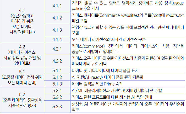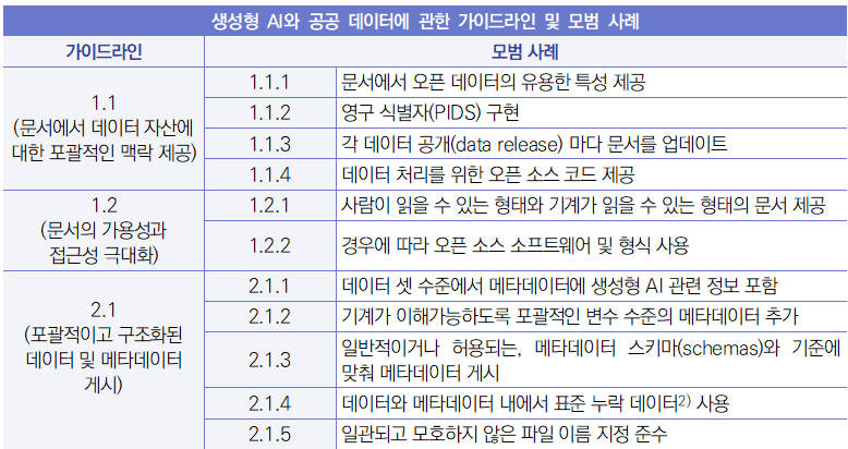 - (배경) 2023년 말, 동 위원회는 ‘AI 및 개방형 정부 데이터 워킹 그룹(AI and Open Government Data Working Group)’을 출범시킴 ∙ 동 그룹은 미국 상무부 내부의 AI 및 데이터 전문가들로 구성되었으며, 생성형 AI 어플리케이션을 활용하여 미국 상무부의 오픈 데이터를 이용하는 사용자의 요구를 잘 충족시킬 수 있도록 오픈 데이터 자산을 효율적으로 생성, 관리, 배포하는 방법을 평가하는 역할을 수행함 ∙ 2024년에 동 그룹은 AI 및 공공 데이터 자산에 대한 정보 요청서(AI and Open Government Data Assets Request for Information, RFI)를 발행하고, 정부, 민간 부문, 싱크탱크, 학계의 AI 및 데이터 전문가들과 협력함 - (주요내용) 동 가이드라인 및 모범 사례는 생성형 AI 시스템에 최적화된 오픈 데이터를 게시하기 위한 실행 가능한 가이드라인과 모범 사례를 제공하며 주요내용은 다음과 같음 ![]() ![]() ![]() 1) 동 지침 및 사례의 원문은 다음의 링크 참조: https://www.commerce.gov/sites/default/files/2025-01/GenerativeAI-Open-Data.pdf 2) 표준 누락 데이터의 영문은 standard missing data 임.