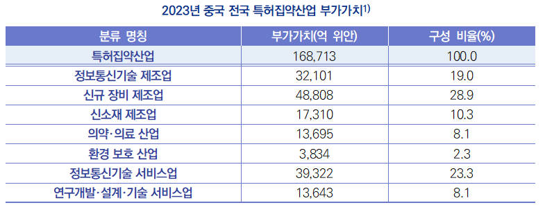 - (개요) 특허집약산업은 특허의 집약도 및 규모가 규정된 표준에 도달하고 지식재산권에 의존해 시장 경쟁에 참여하며 혁신 및 발전 방향에 부합하는 산업 집합을 의미함 ∙ 중국 특허집약산업은 경제 활동의 성격에 따라 크게 ① 정보통신기술 제조업, ② 신규 장비 제조업, ③ 신소재 제조업, ④ 의약·의료 산업, ⑤ 환경 보호 산업, ⑥ 정보통신기술 서비스업, ⑦ 연구개발·설계·기술 서비스업 등의 총 7개 범주로 구분됨 - (주요내용) 동 공고의 주요내용은 다음과 같음 ∙ 2023년 중국 전국 특허집약산업의 부가가치는 16조 8,713억 위안(한화 약 3,337조 3,118억 원)에 달했으며 국내총생산(GDP)에서 차지하는 비중은 13.04%로 전년 대비 0.44%p 증가함 ∙ 세부적으로 살펴보면, 규모가 가장 큰 신규 장비 제조업의 경우 부가가치가 4조 8,808억 위안(한화 약 965조 8,127억 원)으로 특허집약산업의 28.9%를 차지함 ∙ 다음으로는 정보통신기술 서비스업의 부가가치가 3조 9,322억 위안(한화 약 778조 2,610억 원)으로 특허집약산업의 23.3%를 차지했으며, 정보통신기술 제조업의 부가가치는 3조 2,101억 위안(한화 약 635조 3,429억 원)으로 특허집약산업의 19.0%를 차지함 ![]() 1) 데이터의 소계가 총계와 같지 않은 경우가 있다면, 이는 수치의 반올림으로 발생한 오류 때문임. |