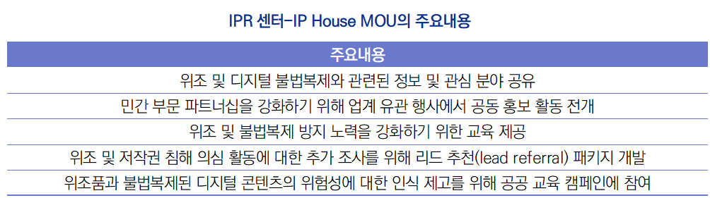∙ 2024년 12월 12일, 미국 국가지식재산권조정센터(National Intellectual Property Rights Coordination Center, IPR 센터)는 위조 및 불법복제 등에 대응하기 위해 지식재산(IP) 침해 조사기업인 IP House社와 양해각서(MOU)를 체결하였다고 발표함