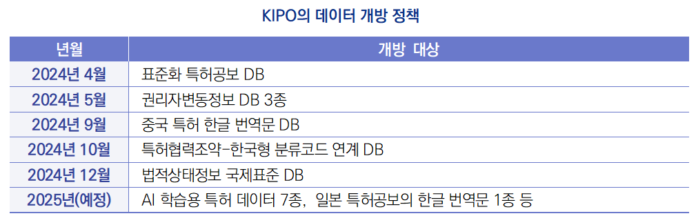 ∙ 2024년 12월 12일, 특허청(KIPO)은 국내에 보유한 특허 및 실용신안의 법적상태정보 약 500만 건을 지식재산권 특허정보 개방 플랫폼인 특허정보활용서비스(KIPRISplus)를 통해 개방한다고 발표함