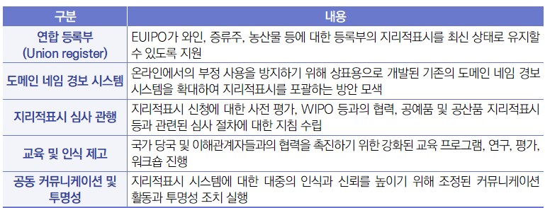 ∙ 2024년 12월 4일, 유럽연합 지식재산청(EUIPO)과 유럽연합 집행위원회(EC) 농업총국(DG AGRI)은 유럽연합(EU) 내 농산물, 와인, 증류주 등에 대한 지리적표시(GI)의 보호 및 관리 강화와 관련된 협정을 체결함으로써 협력을 재확인했다고 발표함