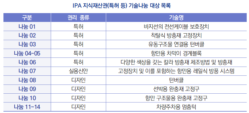 ∙ 2024년 12월 9일, 인천항만공사(IPA)는 ‘IPA 지식재산권(특허 등) 기술나눔 공고’1)를 통해 14건의 나눔기술을 공개하고 2025년 1월 31일까지 신청 기업을 접수한다고 발표함