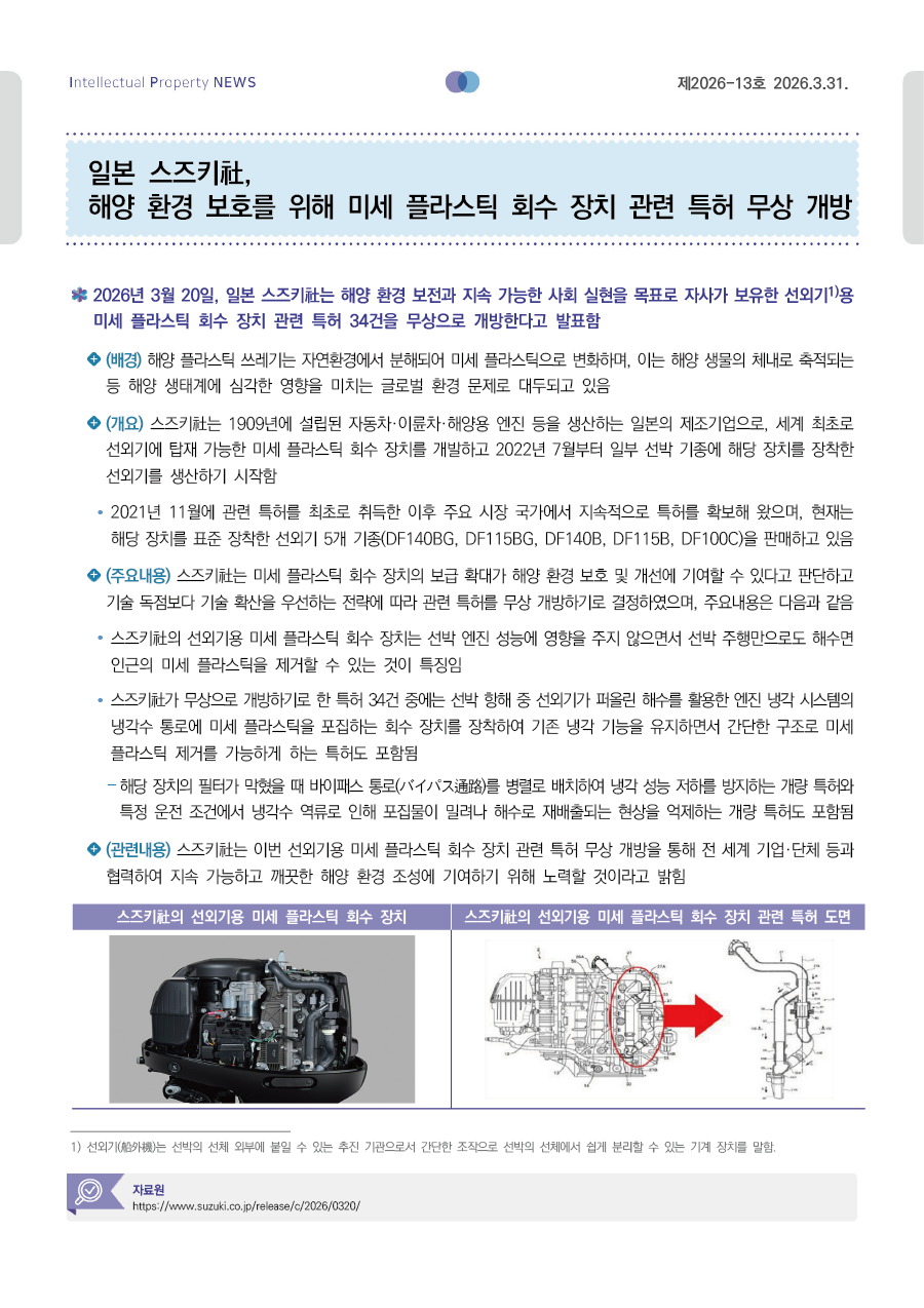 일본 스즈키社, 해양 환경 보호를 위해 미세 플라스틱 회수 장치 관련 특허 무상 개방